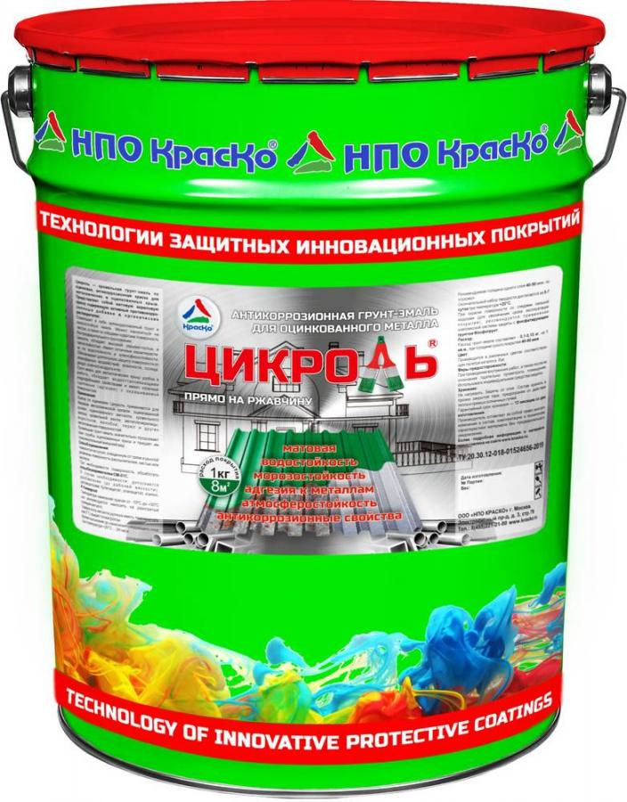 Антикоррозионная грунт-эмаль Цикроль обеспечивает длительную защиту металлической поверхности от атмосферных воздействий, влажности, солнца, дождя, солёного воздуха и т.п. Значительно продлевает срок службы оцинкованных крыш и придаёт им привлекательный вид.