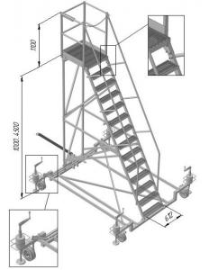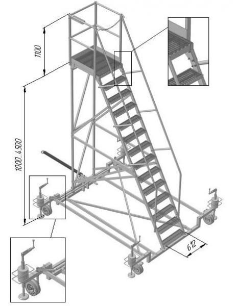 материала АМг) обеспечивающие противоскольжение и самоочищение. Для удобства буксировки Стремянка оснащена рулевой трапецией с дышлом. Устойчивость при работе на ветру обеспечивается аутригерами и регулируется пригрузами. Изготавливаются стремянки