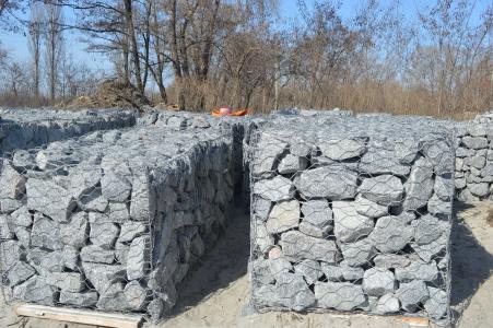 Коробчатые габионы – трехмерные конструкции из металлической сетки с шестигранными ячеями, изготовленной методом вязания, либо сварки на основе крученой проволоки, толщина которой колеблется в рамках 2,7 (3,7 – с полимерным слоем) – 3 мм (4 мм с учетом слоя защитного полимера). Конструкции, разделенные на секционные фрагменты длиной в 1 м, заполняются крупными камнями, отдельные габионы соединяются в протяженные сооружения, служащие подпорными стенами. При заполнении пустот между каменным наполнителем пылью и почвой, а также, илистыми фракциями изделия встраиваются в естественный ландшафт, прорастая растительностью.