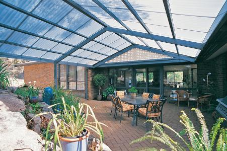Одним из таких решений, стремительно завоевывающим популярность, является профилированный прозрачный поликарбонат. «Этот материал имеет одно неоспоримое преимущество, выделяющее его в ряду прочих решений: он повторяет форму профилированного стального листа МП-20, который широко используется в качестве кровельного покрытия и стеновой облицовки, – говорит Евгений Лазукин, начальник департамента продаж водосточных и кровельных систем Группы компаний «Металл Профиль», ведущего производителя кровельных и фасадных систем в России. – За счет этого профилированный поликарбонатный лист не будет выбиваться из общей архитектурной и дизайнерской концепции дома и прилегающих построек. Профилированный поликарбонат с успехом используется в качестве основного материала для прозрачных кровель, навесов и козырьков. Кроме того, точное повторение контура стального профнастила МП-20 позволяет делать из профилированного поликарбонатного листа МП-20 прозрачные вставки в стену, забор или ворота. И в таком качестве – это единственное в своем роде решение». К другим достоинствам поликарбонатного профилированного листа относятся более чем 90%-ная светопроницаемость, отсутствие помутнения или пожелтения (на всё это распространяется официальная гарантия 10 лет), высокая ударопрочность и морозостойкость, а также способность задерживать ультрафиолетовое излучение. Таким образом, под прозрачной крышей, не опасаясь солнечных ожогов, в течение целого дня могут находиться дети и взрослые. Для южных регионов можно использовать дымчатый поликарбонат, который снижает интенсивность солнечного света на 65% и делает его не таким слепящим. Существуют также варианты поликарбонатного листа с цветной тонировкой. «Тонированный поликарбонат очень декоративен. Он нейтрален и хорошо сочетается с любыми другими цветами. Его использование – одно из эстетических направлений в современной архитектуре, – считает архитектор Евгений Романов (Москва). – К тому же это очень практичное решение. На дымчатом поликарбонате меньше заметны загрязнения, возникающие, например, из-за прилипающей пыльцы растений или битумной пыли от асфальта. Как следствие – конструкции из этого материала не надо часто мыть». Итак, какое же применение профилированному прозрачному поликарбонату можно найти в доме и на приусадебном участке? Сперва остановимся на неотапливаемых помещениях основного дома. Таковыми, прежде всего, являются летние террасы и веранды. Теперь в них можно устраивать не только панорамное остекление, но и делать прозрачные вставки в стенах и кровле. А если сделать на террасе полностью прозрачную, но затемненную или тонированную кровлю, то там будет светло даже в ненастную погоду. Наверное, это очень необычное ощущение: пить чай под проливным дождем. А грамотно подобрав цвет вставок, можно создать для этого чаепития поистине магический антураж.