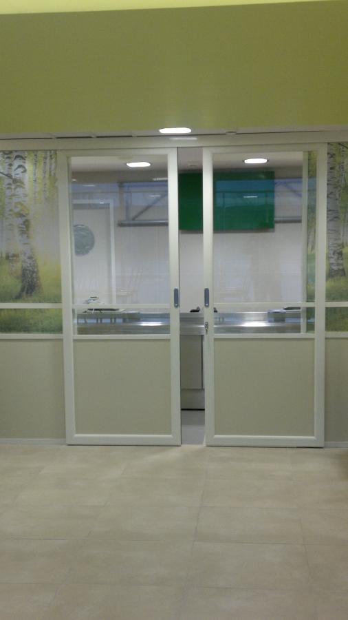 В июне были сданы работы по монтажу офисных перегородок в Сбербанке в г. Москва на ул. Б. Андроньевская. Был применён покрашенный профиль по РАЛ 1013, и установлены нестандартные спецзаказ откатные двери (см. фото).